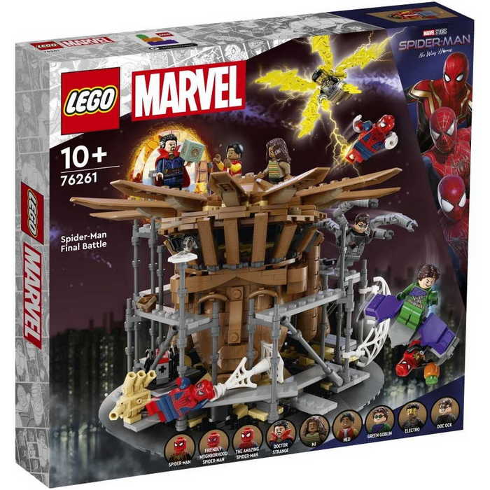 LEGO Marvel Pókember, a végső ütközet (76261) megeleveníti a Marvel Studios Pókember: Nincs hazaút című film igen látványos leszámolását. Az ikonikus szereplőkkel és hálóvető akciókkal teli, Pókember előtt tisztelgő szett lebilincseli majd a 10+ éves rajongókat. 3 univerzum 1 megépíthető játékban A 360 fokos szett a LEGO Marvel minifigurák lenyűgöző választékát kínálja, többek között Pókember 3 verzióját: A barátságos és közkedvelt Pókember (Tobey Maguire), A csodálatos Pókember (Andrew Garfield) és Pókember (Tom Holland). A többi minifigura: Electro, Doctor Strange, Zöld Manó, Ned, MJ és Doc Ock. Számos olyan eleme van, ami fokozza a játék és a kiállítás élményét. Ilyen például a 3 minifigura a levegőben zajló akciókhoz, a levehető tető, ami feltárja Homokember kezét, a portálhoz vezető, felnyitható hátsó járat és a puha hálóelem, amivel beszőheted a minifigurákat. A digitális élmény kedvéért az építők 3D-nézetben ráközelíthetnek és elforgathatják a modelleket és követhetik az építés menetét a szórakoztató L