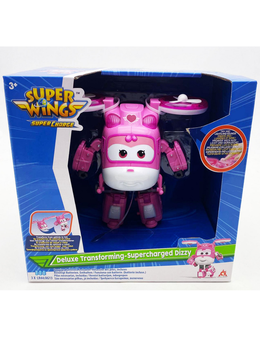 Dizzy a Super Wings szárnyalója most minden eddiginél szuperebb kiadásban csatlakozhat repteredhez. A Deluxe kiadású figura amellett, hogy könnyedén átalakítható robotból repülővé, hang és fény effektekkel lett ellátva.