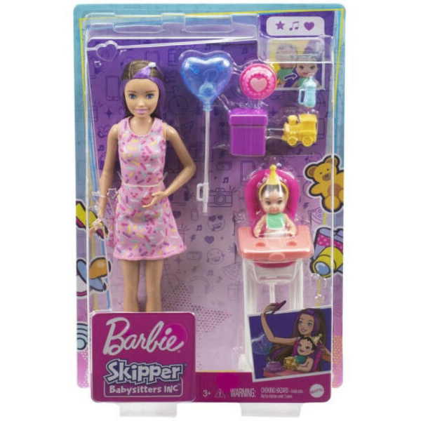 Élje át a gyermekfelügyelet örömeit ezzel a Barbie Skipper Babysitters játékszettel! A csomag egy Skipper babát, egy aranyos kisbabát, etetőszéket és számos születésnapi témájú kiegészítőt tartalmaz, beleértve egy különleges, vízzel aktiválható színváltós funkciót a baba arcán.