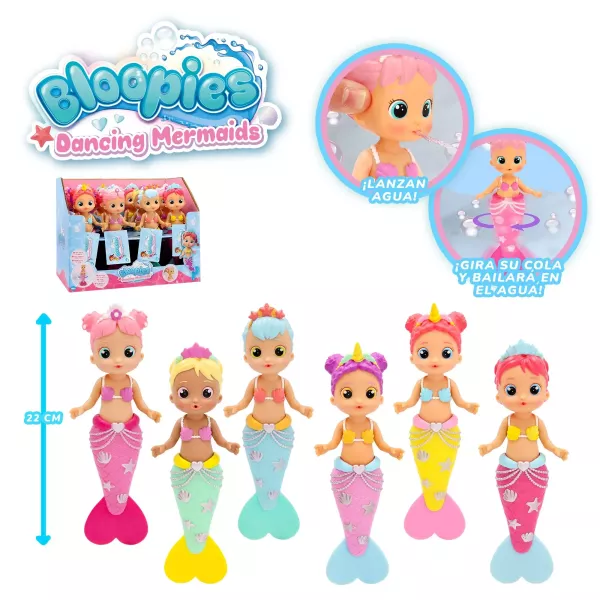 Fedezd fel a Bloopies táncoló sellőbébiket, és varázsold különlegessé a fürdőidőt! Ezek az elbűvölő sellők vidám pillanatokat ígérnek a gyerekeknek mind a kádban, mind a medencében. A sellőbabák 22 cm magasak, és különleges képességük, hogy vízbe helyezve pörögnek, mintha táncolnának. Ráadásul, ha megnyomod a fejüket, vizet spriccelnek a szájukból, így még több móka vár az apróságokra. A színes kollekció 6 különböző sellőt tartalmaz: Natalie, Valentina, Melanie, Naomi, Cora és Hailey.