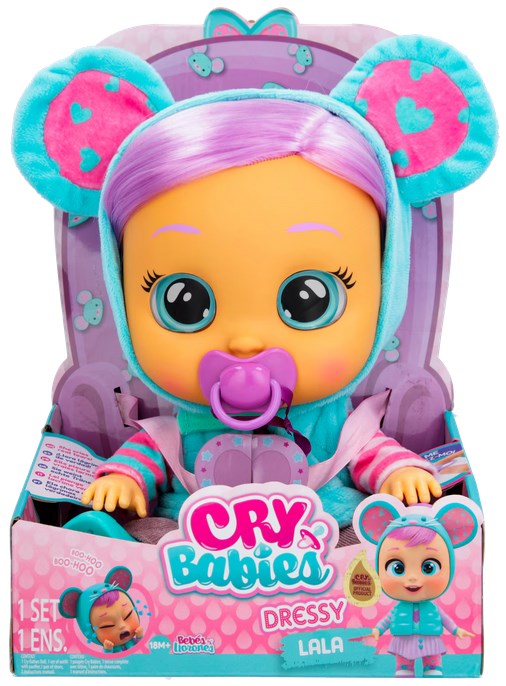 A Cry Babies Dressy Lala egy interaktív síró játékbaba, aki a Cry Babies Dressy sorozat tagja. A baba valódi könnyeket sír és autentikus babahangokat ad ki, ha kivesszük a cumiját, és nyugodtabb, ha visszahelyezzük azt. Lala fésülhető hajjal és levehető ruhával rendelkezik, így kreatív szerepjátékra ad lehetőséget már 18 hónapos kortól.