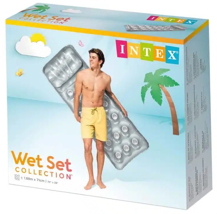 Ez a termék az Intex 18-Pocket Suntanner felfújható strandmatrac, amely modern, áttetsző felső felületével és ezüstösen fénylő alsó részével igazán stílusos, nyári hangulatot teremt a strandolás vagy medencés pihenés során, miközben kényelmes, stabil lebegést biztosít a vízen. A beépített fejtámla extra komfortot ad, így tökéletes választás hosszan tartó napozáshoz és relaxáláshoz. Méret: 188 x 71 cm, amely egy személy számára ideális fekvőfelületet kínál. Anyag: strapabíró, kb. 0,28 mm vastag PVC/vinyl, két külön légkamrával a nagyobb stabilitásért és tartósságért. Korosztály: 14 éves kortól ajánlott, így tinédzserek és felnőttek számára is kényelmes és biztonságos választás. Ez a matrac egyszerre praktikus vízi kellék és letisztult, trendi nyári kiegészítő, amely minden vízparti pihenést élménnyé emel.