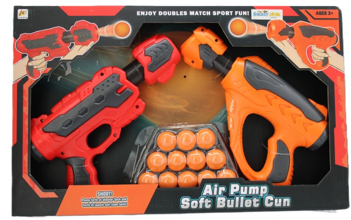 Ez a termék egy két darabos Air Pump Soft Bullet Gun szett, amely vidám, mozgásos játékélményt kínál gyermekeknek. A csomag 2 db könnyű műanyag puskát és hozzájuk 12 puha, habból készült lövedéket tartalmaz, amelyekkel biztonságosan célba lőhetnek egymásra vagy célpontokra. A játék ergonómikus kialakítású, könnyen pumpálható mechanikával működik, így a gyerekek aktívan játszhatnak és fejleszthetik a céllövő képességüket játék közben. Anyag: strapabíró műanyag és puha hab lövedékek. Korosztály: 3 éves kortól ajánlott, ideális első céllövő játékokhoz. Csomag mérete kb. 46,5 x 6 x 29 cm, így kompakt és könnyen tárolható darab a gyerekszobában vagy utazásnál.