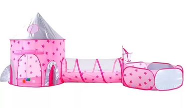 Gyerek játszósátor szett - 3 részes, vár alakú kialakítással. Ez a csillag mintás, látványos játszósátor szett három elemből áll (2 sátor és 1 alagút), amelyek külön-külön vagy összekapcsolva is használhatók, így változatos és aktív játékélményt biztosítanak. A tágas kialakításnak köszönhetően több gyermek számára is ideális, miközben fejleszti a képzelőerőt és a mozgáskoordinációt. Könnyű, mégis stabil szerkezete egyszerűen felállítható és összecsukható, így beltéri és kültéri használatra egyaránt alkalmas. Jellemzők: 3 részes szett; vár alakú design; csillag mintás anyag; összecsukható kivitel; könnyű, stabil szerkezet; gyors összeszerelés; méret: kb. 178 x 152 x 203 cm; 3 éves kortól.