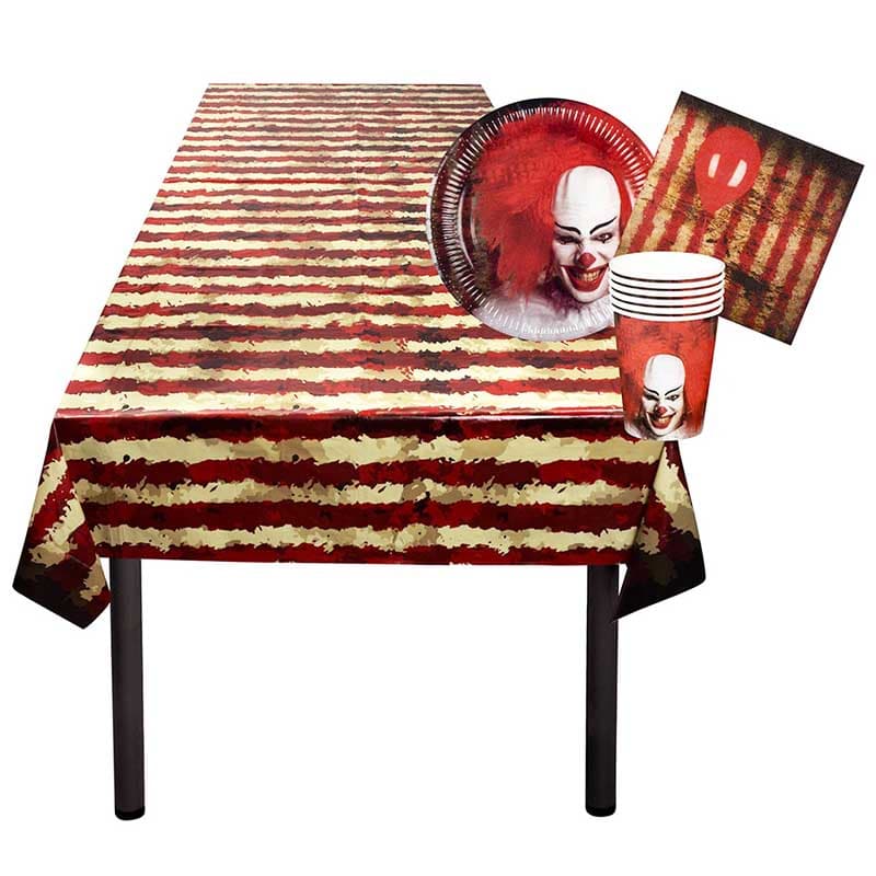 Megnevezés | Halloween horror bohóc party szett 6 személyre (terítő, szalvéta, papír tányér és pohár) (158187) |