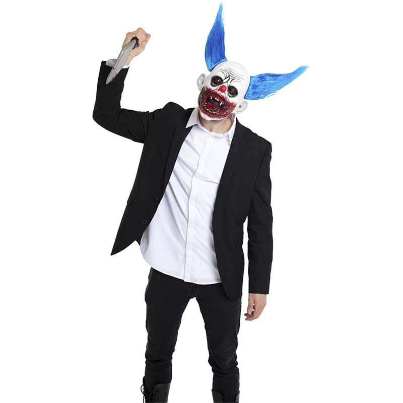 Ha szeretnél egy ijesztő és élethű maszkot, ami az egész fejedet körbe öleli akkor ez a maszk tökéletes lehet számodra. Válaszd ezt a hatalmas kék hajú ijesztő bohóc maszkot, ami latexből készült és válj te a legijesztőbb parti arccá. 8 éves kortól bárki kényelmesen hordhatja még akár felnőttek is. Nézz szét oldalunkon, ahol további Halloween kiegészítőket is találsz egy fergeteges partihoz!
