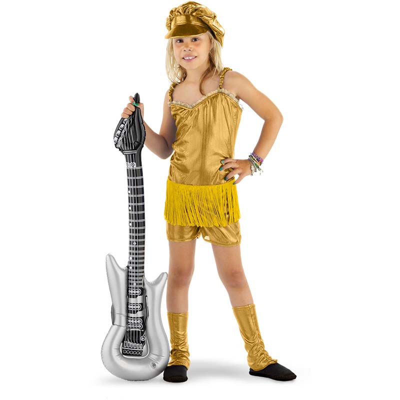 Hollywoodban járunk és ez a személy nagyon szeret énekelni. Ráadásul sok-sok rajongója van és gitározni is tud. Na, kitaláltad már, kire gondoltunk? Bizony, egy rocksztárról van szó! Legyél egy híres rockénekes a farsangi buliban és mutasd meg a jelmezverseny zsűrijének, milyen ügyesen gitározol a színpadon! Csak vedd fel ezt az aranyszínű jelmezt, igazítsd meg a kalapodat és a hajadat és már készen is állsz a világ körüli turnédra! Neked melyik a kedvenc számod? A jelmezszett tartalma: ruha, kalap, lábdísz. Az L-es jelmez 134-152-es méretnek felel meg és 8-11 éves kor közötti lányoknak ajánljuk. A kép illusztráció, a jelmez nem tartalmaz minden kiegészítőt!