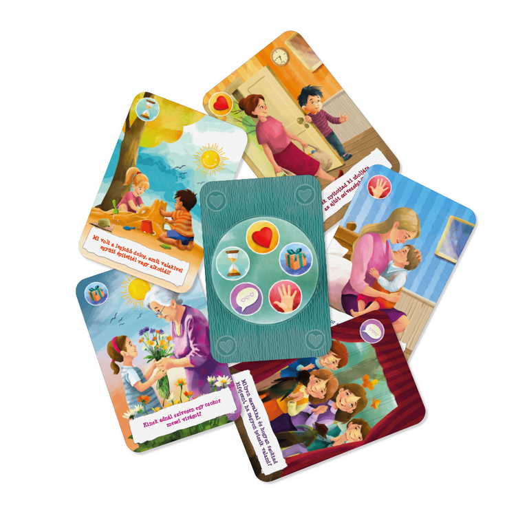 Szívmanó és a szeretetnyelvek kártyajáték az érzelmi kommunikáció és a kapcsolati kötelékek elmélyítéséhez. A gyermekek egészséges fejlődésének alapja a szeretetteljes, biztonságot adó kapcsolat. Ha a gyermek úgy érzi, hogy szeretik és megértik, akkor könnyebben fejlődik az önbizalma, stabilabb lesz az érzelmi világa, és nyitottabban kapcsolódik másokhoz. A szeretetnyelvek segítenek abban, hogy ne csak adjunk szeretetet, hanem valóban el is juttassuk azt a gyermek szívéhez. A Szívmanó és a szeretetnyelvek kártyajáték célja, hogy a gyermekek és nevelőik érzelmi kommunikációjának fejlődését játékosan támogassa.