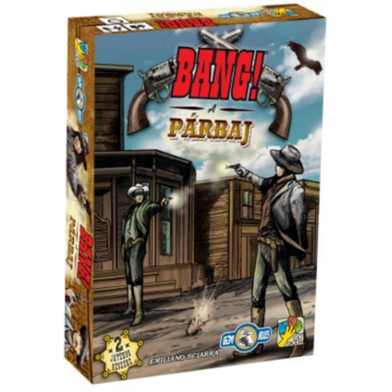 A törvény emberei végre szemtől szemben találkozhatnak a törvényen kívüliekkel.áEljött a végső leszámolás ideje, itt bizony rövid időn belül komoly tűzpárbajra kerül sor! A játék során mindkét játékos egyszerre két-két cowboyt irányít: egyet elől, szemtől szemben ellenfelével, és egyet hátvédként. Csak szereplőid jól megfontolt pozicionálásával és tulajdonságaik legjobb kihasználásával reménykedhetsz a győzelemben - ami akkor jön el, ha ellenfeled összes karaktere végre fűbe harapott!A Bang! A párbaj önálló játék a BANG! világában. Nincs hozzá szükség a BANG! alapjátékra.A doboz tartalma:80 kártya24 szereplő1 előkészületek és 4 összefoglaló kártya2 aktívszereplő-jelző20 töltényjelzőjátékszabály