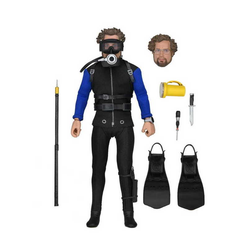 Jaws is considered one of the greatest achievements in film, paving the way for what would become the summer blockbuster. NECA is excited to announce a new 8 clothed figure featuring the licensed likeness of Richard Dreyfuss as Matt Hooper from the 1975 classic. Based on the shark cage scenes, this action figure of the young oceanographer stands 8 tall and is equipped with screen-accurate accessories (flippers, spear, underwater light, knife, and oxygen tank) as well as swappable heads. Window box packaging.