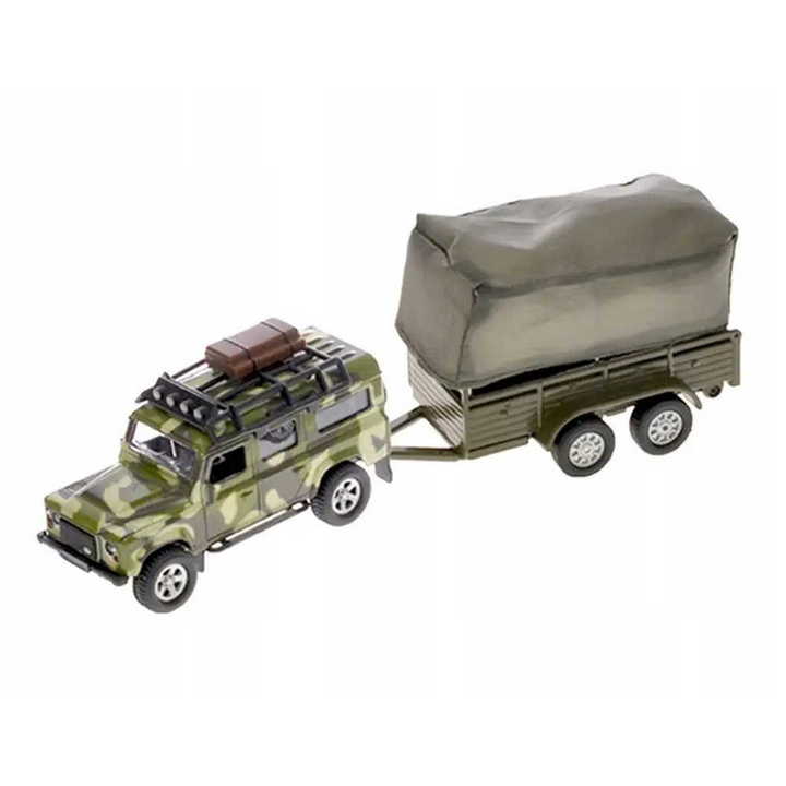 A terepszínű katonai Land Rover azonnal egy erdőben tett terepjáró expedícióra emlékeztet. A modell realisztikus megjelenésű, tetőcsomagtartóval és egy terepjáró jellegzetes sziluettjével rendelkezik, a csatlakoztatott utánfutó pedig lehetővé teszi képzeletbeli felszerelések és felszerelések szállítását. Az egész egy olyan járművet hoz létre, amely készen áll a nehéz terepen való küldetésekre.