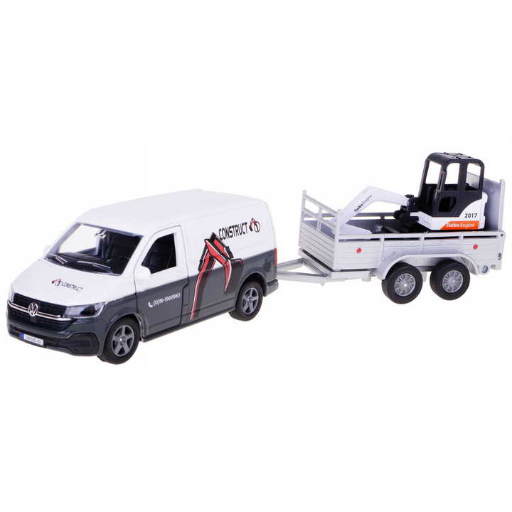 A Volkswagen Transporter pótkocsival és miniatűr kotrógéppel egy olyan dizájn, amely azonnal az építkezésen végzett munkát és a berendezések szállítását idézi fel. A jármű realisztikus, könnyen felismerhető sziluetttel rendelkezik, a csatlakoztatott pótkocsi pedig lehetővé teszi egy kis építőipari gép szállítását. A kotrógép mozgatható karral rendelkezik, amelynek köszönhetően a gyermek különböző munkahelyzeteket hozhat létre és új feladatokat vállalhat a játék során.