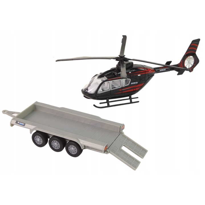 Ez a szórakoztató készlet egy masszív, nyitható ajtókkal ellátott terepjárót tartalmaz. A jármű hátrahúzós motorral rendelkezik. Egy klassz játékhelikopter van a hozzá illő utánfutóhoz rögzítve.