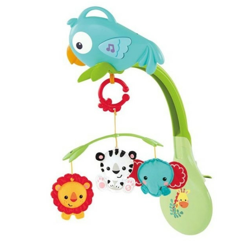 A kiságyforgó 20 percig zenél. A madárka andalító zenéje és a többi állatka lassú mozgása nyugtatgatja és biztonságérzetet ad a babáknak. A forgó a babakocsi napellenzőjére is felakasztható, a madárka levehető a forgóról, hogy további vidám zenével szórakoztassa a vele játszó bébit. A kiságyforgó 3 x AA 1.5 (LR6) elemmel működik. Több, mint 20 percnyi folyamatos zene a Fisher Price játékától. 3 az 1-ben esőerdős kiságyforgó, mely a babaágyon és a babakocsin is rögzíthető. Ajánlott korosztály: 0+