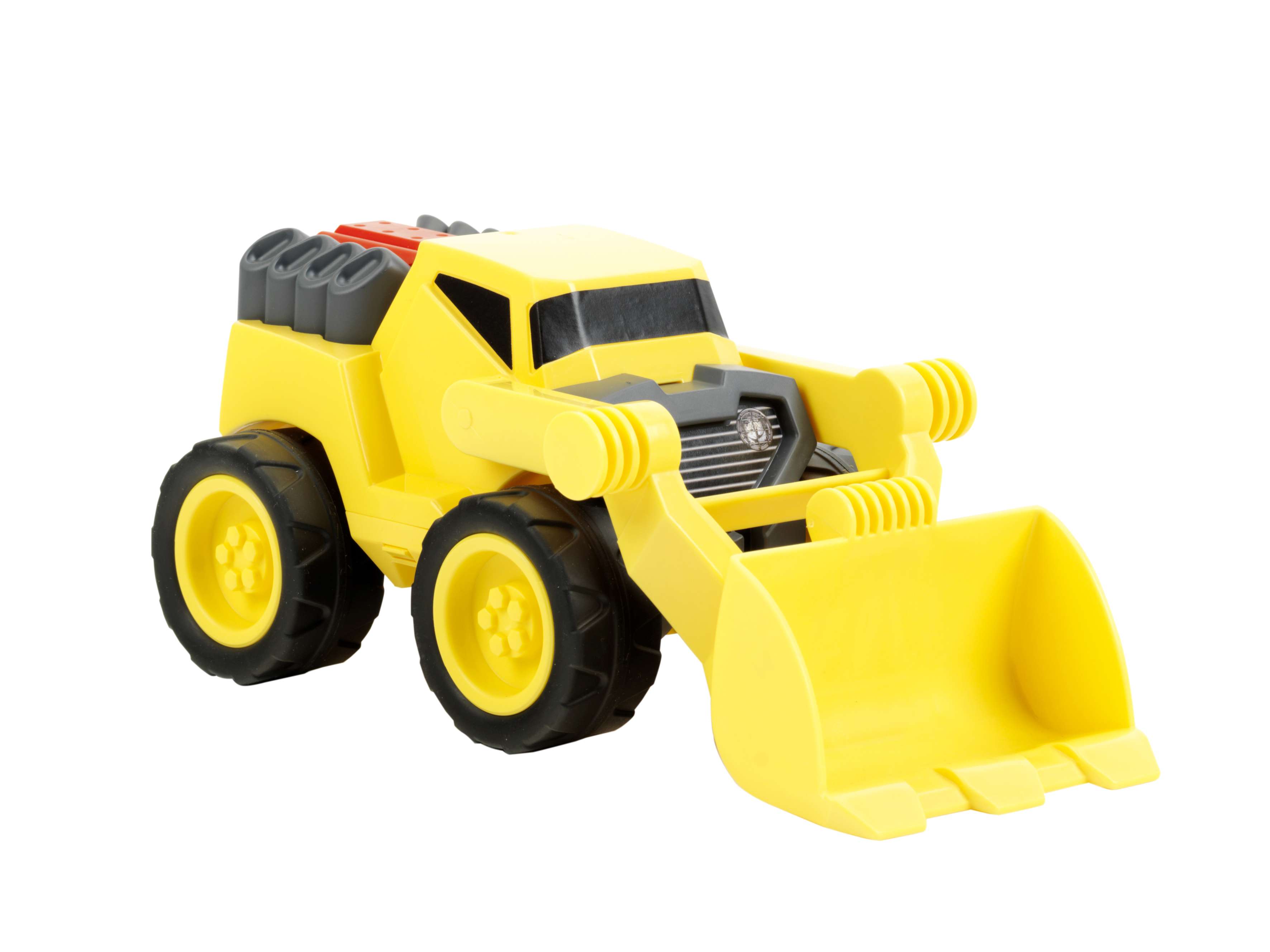 Ez a kerekes rakodógép a legfiatalabb építőmunkások számára készült: nagyméretű lapátja robusztus csuklókra van felfüggesztve, amelyeket a kis kezek könnyen és biztonságosan beállíthatnak. A széles gumiabroncsoknak és a masszív alváznak köszönhetően a kerekes rakodó bármilyen terepen és bármilyen teherrel megbirkózik