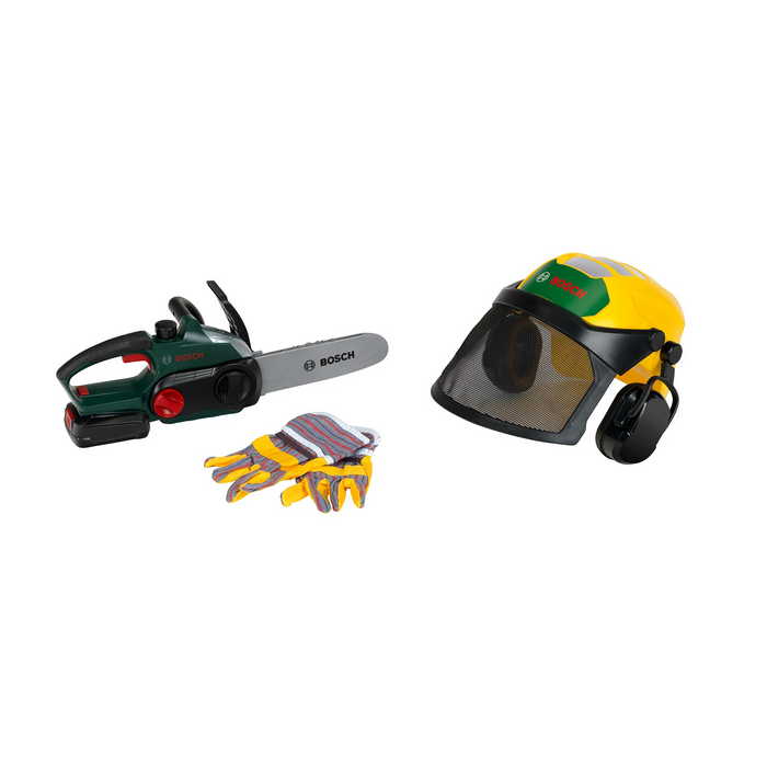 Az elemes Bosch láncfűrész realisztikus funkcióival nyűgözi le a gyerekeket: a fűrészlap felhelyezésekor hiteles fűrészhang hallatszik, míg egy villogó fény szimulálja a munkát. A még nagyobb játékélmény érdekében a fűrészlap cserélhető. A robusztus erdészsisak méretre állítható, mozgatható napellenzővel és fülvédővel rendelkezik, a hozzá illő kesztyűk pedig igazi erdészérzetet keltenek.