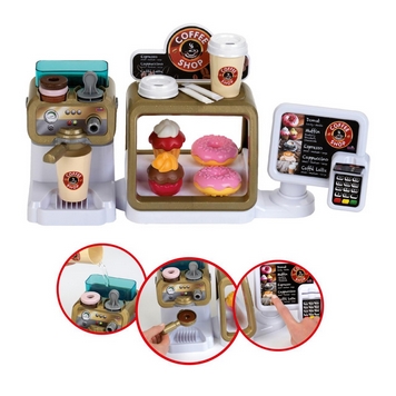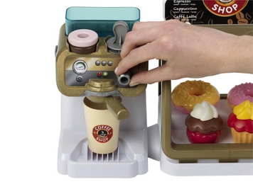 Ez a Klein Coffee Shop (9501) egy rendkívül részletgazdag, interaktív kávézó szerepjáték játékszett, amelyben a gyerekek saját kis kávézót üzemeltethetnek, a készlet tartalmaz egy játék pénztárgépet, hanghatásos kávéfőzőt, kapszulákat, csészéket fedéllel, cukros tasakokat, fánk kiegészítőket és egyéb kávézós eszközöket, így teljes vendéglátós élményt nyújt, ahol rendelést vehetnek fel, "kávét készíthetnek" és kiszolgálhatják a vendégeket, miközben fejlődik a kommunikációjuk, kreativitásuk és szerepjáték készségük. Méret: kb. 45 x 23,5 x 13 cm-es, nagyobb méretű asztalon használható játékszett több interaktív elemmel. Anyag: tartós, gyermekbarát műanyagból készült játékelemek. Korosztály: 3 éves kortól ajánlott, szerepjátékhoz, szociális készségek fejlesztéséhez és kreatív játékhoz ideális, hosszú ideig leköti a gyerekeket.
