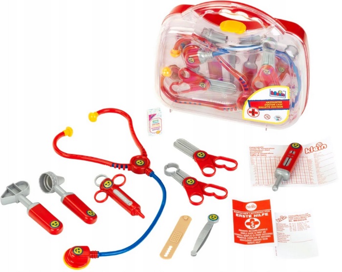 Ez a Klein orvosi készlet átlátszó bőröndben egy klasszikus, szerepjátékra épülő gyerek játékszett, amelyben a kicsik saját "kis orvosi rendelőt" hozhatnak létre, a csomagban több valósághű orvosi eszközt utánzó kiegészítő található, például sztetoszkóp, fecskendő, lázmérő, fültükör és egyéb vizsgálóeszközök, amelyek egy átlátszó, praktikus bőröndben vannak elhelyezve, így könnyen rendszerezhetők és hordozhatók, miközben a gyerekek játék közben megismerkedhetnek az orvosi szerepekkel és fejleszthetik a fantáziájukat. Méret: kompakt, hordozható műanyag bőrönd kb. 22 x 20 x 9 cm-es kialakítással, több darabos kiegészítő készlettel. Anyag: tartós, gyermekbarát műanyagból készült orvosi eszközök és átlátszó műanyag bőrönd. Korosztály: 3 éves kortól ajánlott, szerepjátékhoz és készségfejlesztéshez ideális, segíti a képzelőerő és a szociális készségek fejlődését.