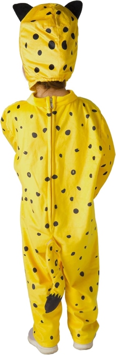 Ez a gyermek méretű leopárd jelmez puha plüss anyagból készült egyberészes ruhadarab, amelyhez egy levehető farok és egy mintás sapka arc- és füldíszekkel tartozik. Ideális választás farsangi bulikra, születésnapi partikra vagy játékos szerepjátékokhoz, kényelmes viseletet biztosítva a kicsik számára.