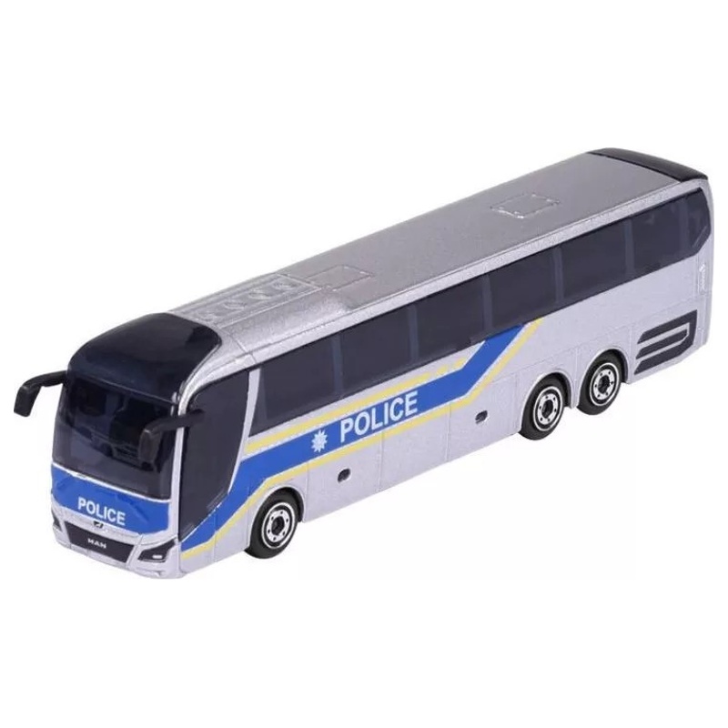 A MAN Lions Coach L Police bus a City MAN sorozat egyik legkülönlegesebb darabja, mert a hagyományos távolsági busz formát rendőrségi dekorral kombinálja. A modell kb. 13 cm hosszú, fém karosszériával készül, szabadon futó kerekeket kapott, ezért strapabíró és jól guruló játékjármű. A Police kivitel miatt ez a változat különösen izgalmas lehet a mentő, rendőrségi és speciális járművek kedvelőinek. Gyűjtői darabnak is remek, mert a megszokott buszos modellek között egyedi hangulatot képvisel.
