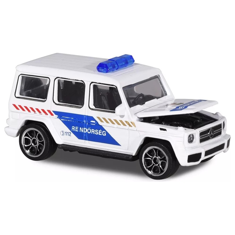 A Mercedes-AMG G 63 rendőrautó a Majorette S.O.S. Cars sorozat egyik legkarakteresebb darabja, amely a luxus terepjárók és a rendőrségi járművek hangulatát ötvözi. A modell 1:64 méretarányú, fém kivitelű, és a kereskedői leírások szerint nyitható elemmel is készül, ami még érdekesebbé teszi játék közben. A fehér rendőrségi festés nagyon jól áll ennek a szögletes, erőt sugárzó típusnak, ezért a gyűjteményben is könnyen kitűnik. Jó választás lehet azoknak, akik a különleges rendőrautókat vagy a Mercedes-AMG modelleket kedvelik.