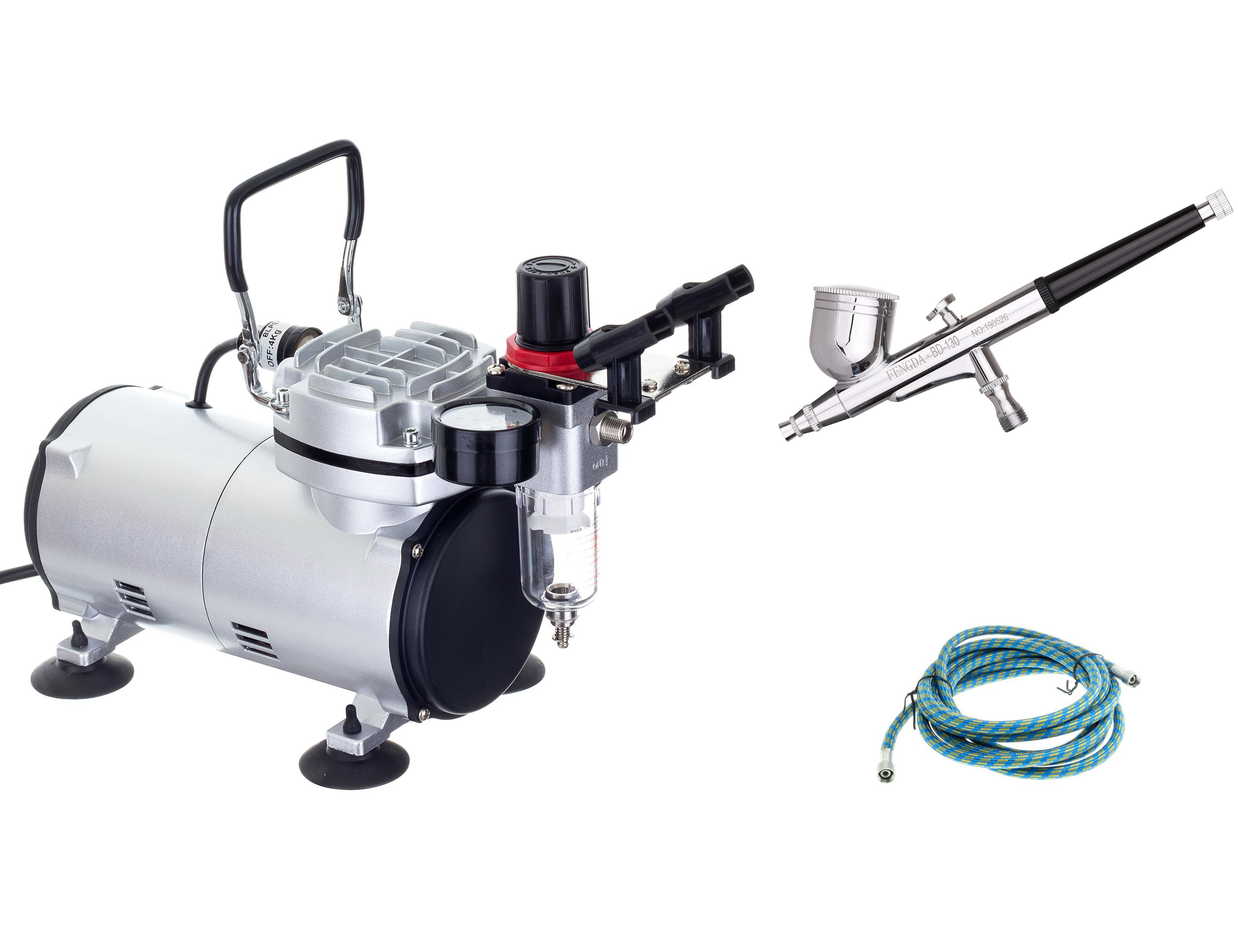 Komplett airbrush komrpesszorszett olajmentes, csendes mini kompresszorral és dupla működésű (double action) pisztollyal, ami ideális makettezéshez, miniatűr festéshez, dekorációs fújáshoz. A kompresszor automata indítás/leállításos (kb. 3 bar-nál indul, 4 bar-nál leáll), max. 4 bar / 57 PSI, légszállítás kb. 20-23 l/perc , stabil, hobby felhasználásra kifejezetten jó.