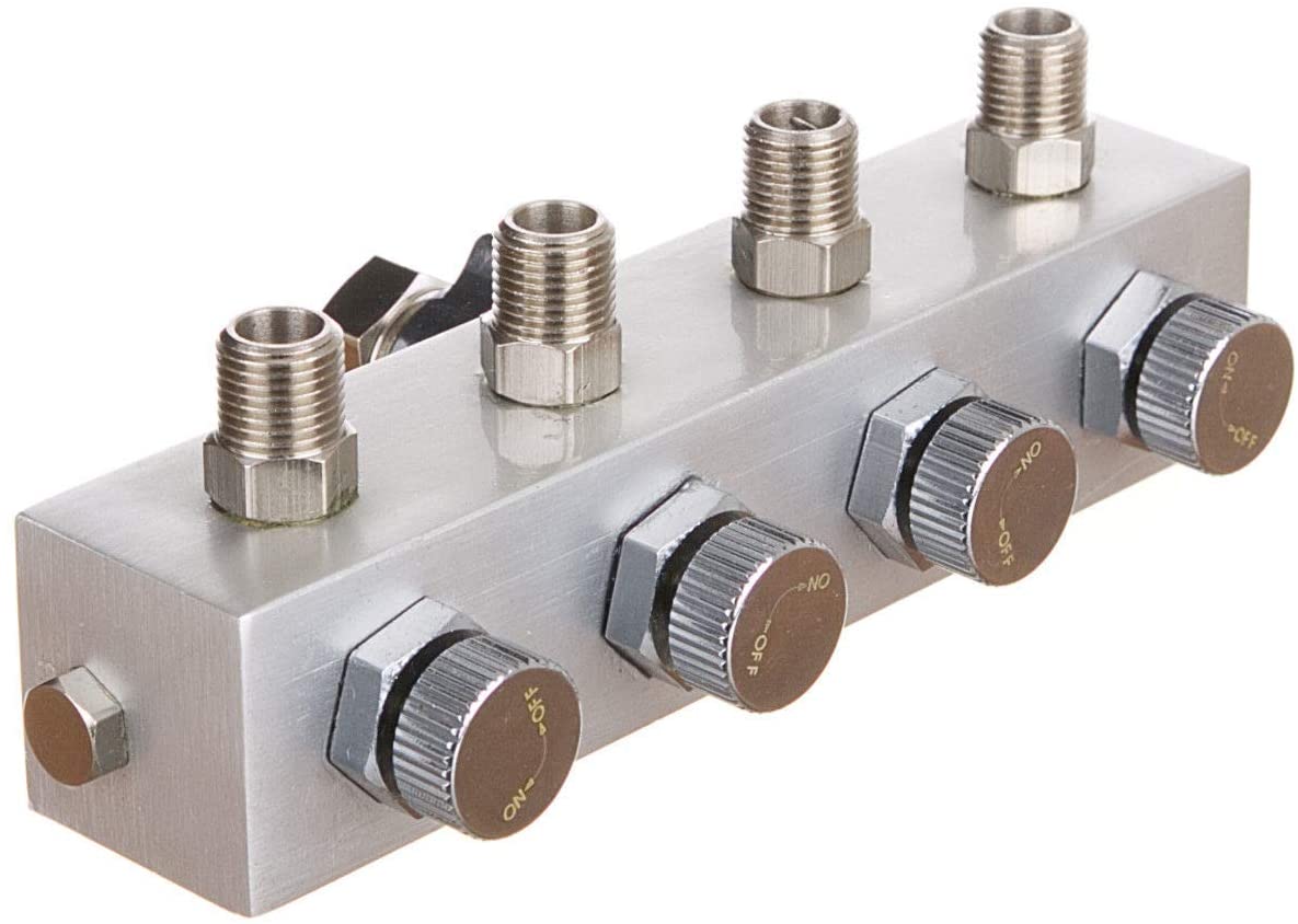 Segítségével egy kompresszorról négy szórópisztolyt üzemeltethetünk, így nem kell az eszközöket cserélgetni, elég az egyiket félre tenni, a másikat pedig azonnal gond nélkül üzemeltethetjük. Az elosztó 1/8"-os menettel lett szerelve, zárógyűrűvel lett ellátva.