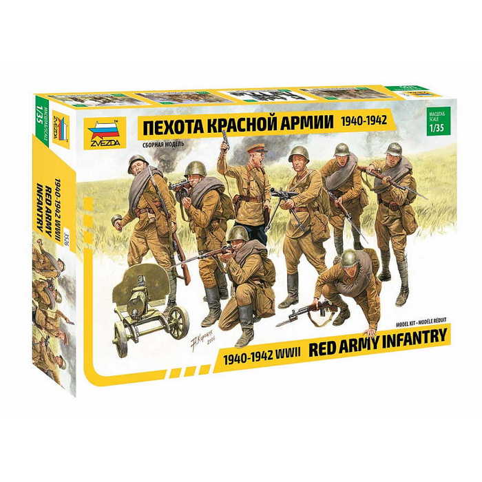 Festést, ragasztást igénylő makett.A hét közlegény figurából és a Vörös Hadsereg parancsnokának figurájából álló készlet a támadás pillanatában, a katonák a Nagy Honvédő Háború korai időszakának terepszínű egyenruhájában. A katonák különböző rendszerű puskákkal, egy Djagterev rendszerű kézigéppuskával és egy Maxim rendszerű géppuskával vannak felfegyverkezve.Gyártó: Zvezda
