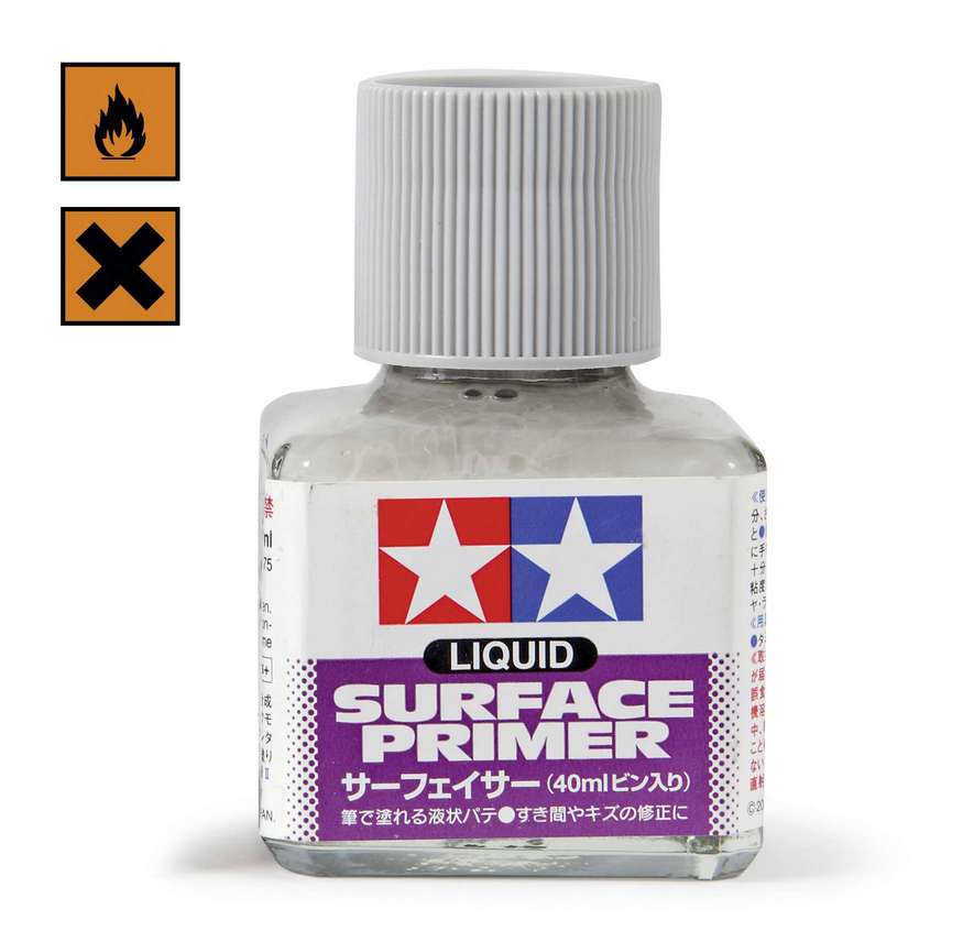 Tamiya Liquid Surface Primer - Folyékony alapozó makettekhez, amely sima, egyenletes festékalapot képez. Javítja a festék tapadását, kitölti a finom felületi hibákat és egységes, profin festett felületet biztosít minden műanyag, fém vagy resin alkatrészen.