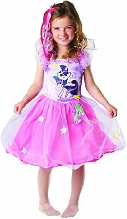 Teljes gyerek jelmez Twilight Sparkle karakter ihletésében, amely egy mintás ruhát szoknyával és levehető szárny-elemmel ad látványos viseletet farsangi bulikra, tematikus eseményekre vagy szerepjátékhoz. A jelmez könnyű, kényelmes anyagból készült, így egyszerű a fel- és levétel, és mozgás közben is jól tart. A ruha mintázata csillagos, menő megjelenést kölcsönöz, ami segít a gyermeknek beleélni magát a mesés póni karakter szerepébe. A szárnyak rögzíthetők és kreatívabbá teszik a jelmezt így a kis hercegnő igazán különleges lehet a jelmezes eseményeken.