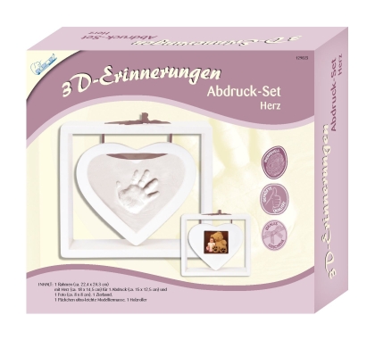 Tartalom: 1 keret (kb. 22 x 20 cm) szívvel (kb. 18 x 15 cm) 1 nyomat (kb. 15 x 13 cm) és 1 fénykép (kb. 8 x 8 cm) számára, 1 csomag ultrakönnyű gyurma, 1 fahenger, 1 díszítőszalag, 1 használati utasítás.