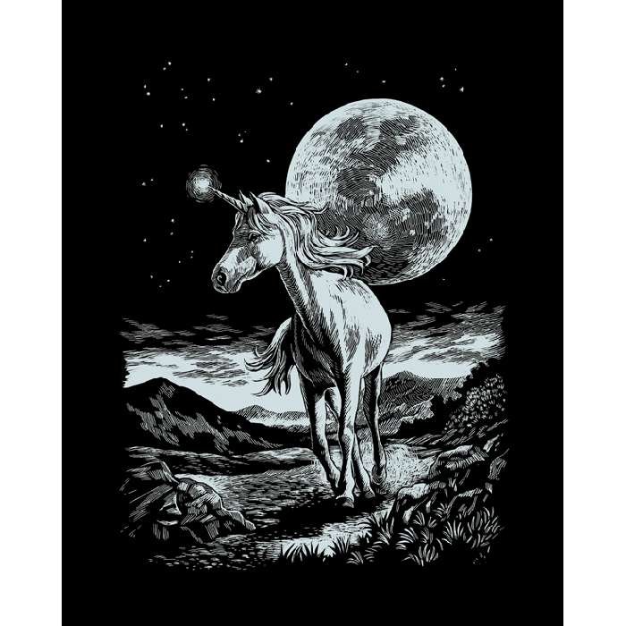 A halvány körvonalakkal előrajzolt sablont, a készletekben található eszköz használatával tehetjük teljessé. A képkarcolás technikája könnyen elsajátítható, hiszen minden szettben találhatunk egy próbalapot, amely segítségével kedvünkre gyakorolhatunk. Látványos szobadísz sőt, egy igazán kedves, saját kezűleg készített egyedi ajándék lehet, a fekete alapon készített ezüst karcolat, melynek mérete: 31 x 21 cm.