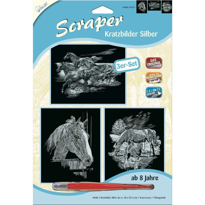 3 ezüst képkarcoló (kb. 20 x 25,5 cm), 1 karcoló kés, 1 gyakorlólap