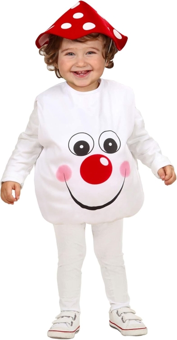 Ez a gyerekeknek szánt jelmez egy puha, teljes testre kiterjedő overált és hozzá illő fejdíszt tartalmaz, mely egy vidám gomba-motívumot formáz megbújtatva. Kényelmes viselet farsangi bulikra vagy szerepjátékokhoz, könnyen felvehető és játékos megjelenést ad minden kis szereplőnek.