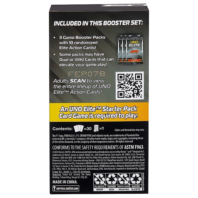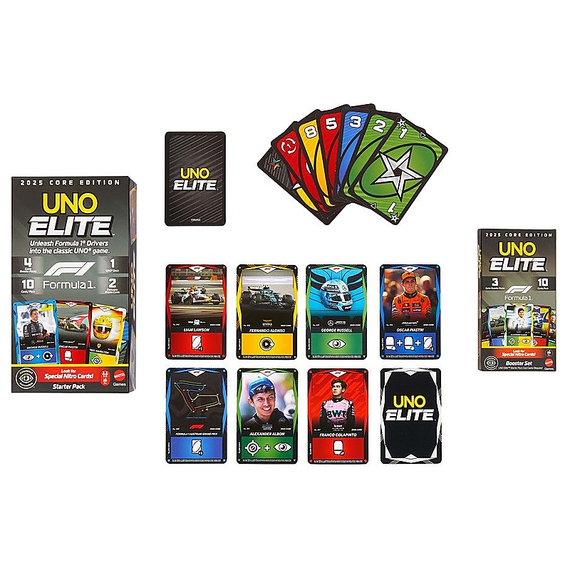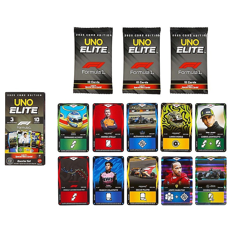 Az UNO Elite Formula 1 2025 Core Edition Booster Set az alap UNO Elite Formula 1 játékhoz használható kártyajáték bővítő. A játék 2-5 fő részére ajánlott, 7 éves kortól, a menetek pedig az UNO-hoz hasonlóan gyorsak és pörgősek. A csomag 3 booster pakkot tartalmaz, csomagonként 10 Elite akciókártyával, így összesen 30 új lap kerül bele. A játék lényege, hogy az alapjátékhoz új Elite lapokat ad, amelyek extra taktikai lehetőségeket és új Formula 1 hangulatú fordulatokat visznek a partijába. A kártyák között pilóták, autók, sisakok, versenypályák, csapatfőnökök és tartalékpilóták is megjelennek, mindegyik saját speciális képességgel. Az egyes Elite lapok saját speciális képességgel rendelkeznek, amelyek akkor aktiválódnak, amikor a játékos egy megfelelő színű, Elite ikonnal jelölt lapot játszik ki. Nyelvét tekintve nyelvfüggetlen, szimbólumalapú kiegészítő.