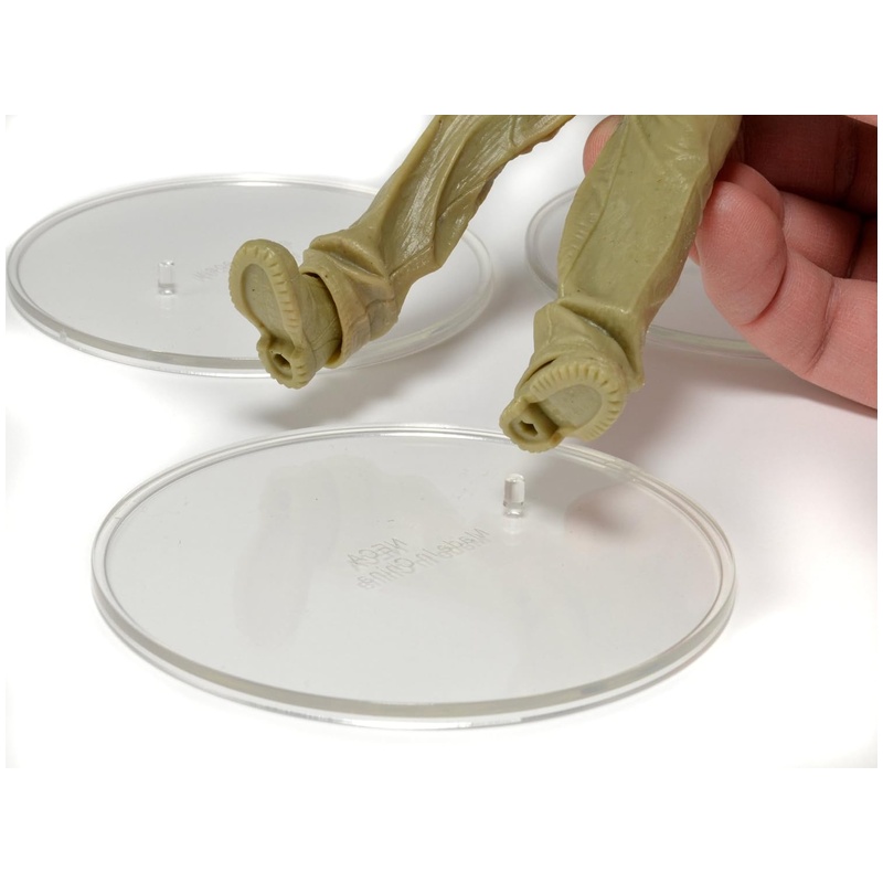 10 darab áttetsző, kerek kiállító talp akciófigurákhoz, elsősorban kb. 15�20 cm magas figurákhoz. A talpak átmérője kb. 9 cm, a középső rögzítő peget a figura jobb vagy bal lábába lehet illeszteni, így stabilabban áll és könnyebb dinamikus pózokba tenni. Bliszteres csomagolásban érkezik, polcos és vitrines kiállításhoz praktikus kiegészítő.