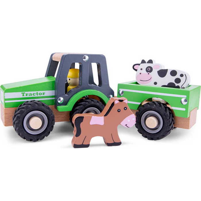Indulj kalandra a vidéken ezzel a New Classic Toys fa traktorral! Ez a játékkészlet egy traktort tartalmaz, amelynek levehető pótkocsija van, így a gyerekek a traktort önállóan is tologathatják. A készlethez két aranyos farmállat, egy tehén és egy ló is tartozik, amelyek készen állnak, hogy elkísérjenek minden utazásra.