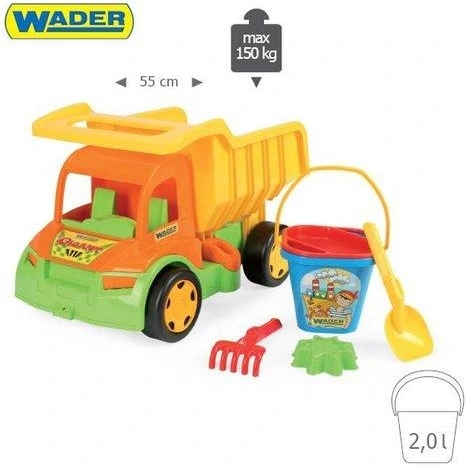 A Wader Óriásdömper 5 részes homokozó szettel egy nagy méretű, strapabíró műanyagból készült dömperjáték, amelyhez egy 5 részes homokozó kiegészítő készlet (pl. vödör, lapát, gereblye, szita és forma) is tartozik, így ideális szórakozást nyújt kertben, strandon vagy homokozóban való játékhoz. A dömper billenő platóval rendelkezik, amely megkönnyíti a homok szállítását és ürítését, ezáltal kreatív játékélményt biztosít gyermekek számára.