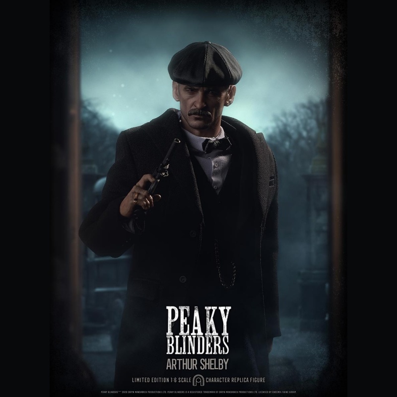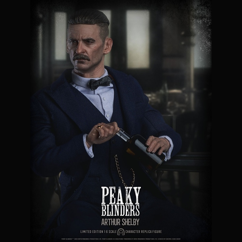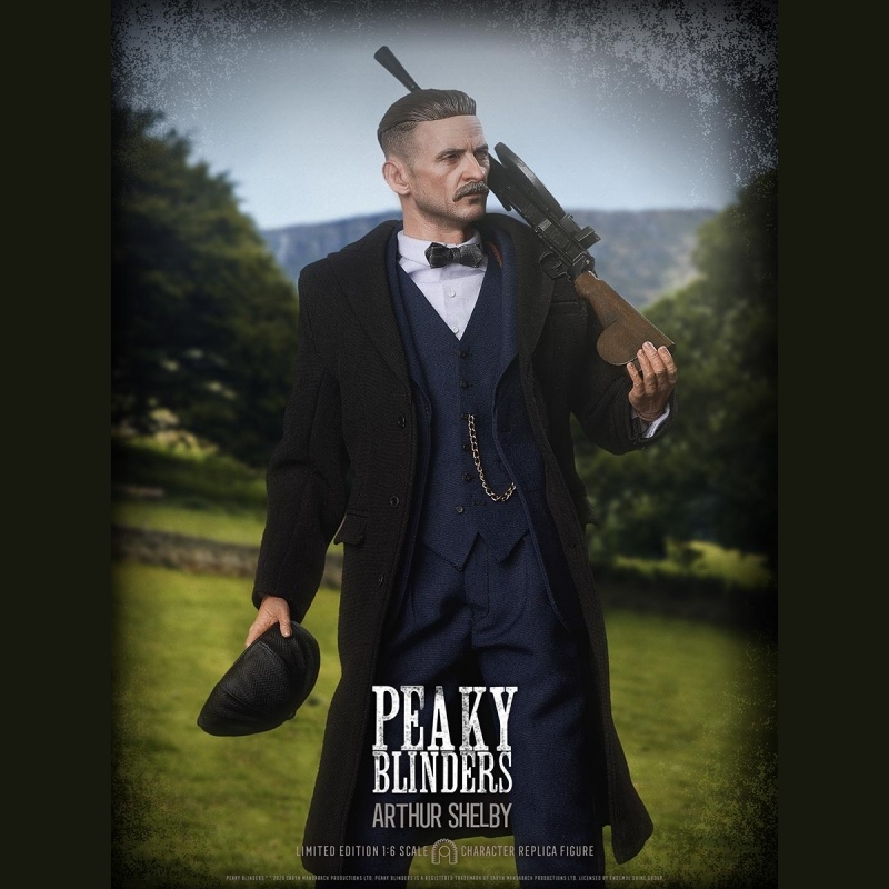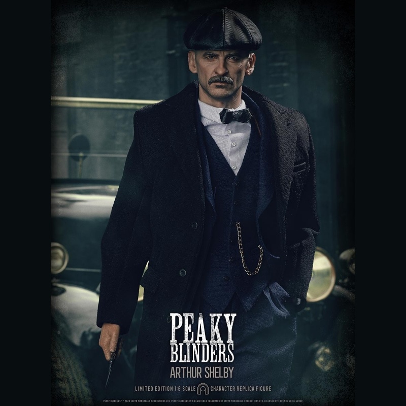 Arthur Shelby a Peaky Blinders sorozat egyik meghatározó karaktere. Ez a 1/6 méretarányú, kb. 30 cm-es gyűjtői akciófigura részletgazdag, valódi textil ruházattal készül, és több ponton mozgatható, így könnyen pózolható vitrinben is. A csomag jellemzően cserélhető kezeket és több kiegészítőt ad, valamint egy talpat, ami kiállításhoz stabil tartást biztosít. Limitált, gyűjtői kiadásként szokták listázni.