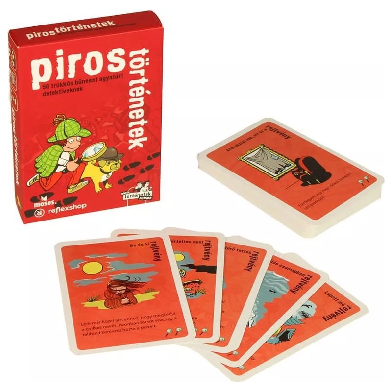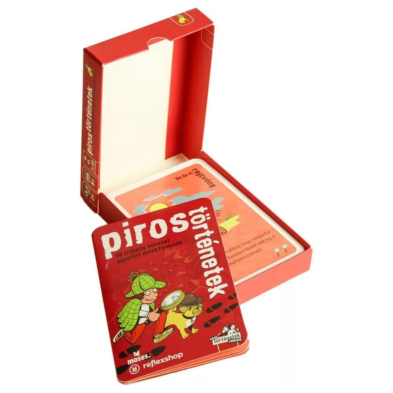 A Piros történetek egy gyerekbarát nyomozós partijáték, amelyet jellemzően 2-8 fő játszhat, a játékidő általában 30-60 perc. A játék lényege, hogy a játékosok kérdésekkel, találgatásokkal és logikus következtetésekkel próbálják megfejteni a rejtélyes eseteket. A feladványok közös gondolkodásra épülnek, ezért családi vagy baráti társaságban is jól működik. A magyar nyelvű kiadás külön előny, mert a történetek és a kérdezős nyomozás így könnyebben követhető. Jó választás lehet azoknak, akik egy könnyedebb hangulatú, mégis gondolkodtató rejtélyes játékot keresnek.