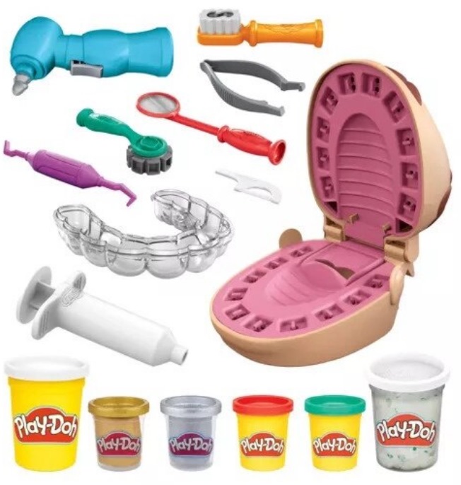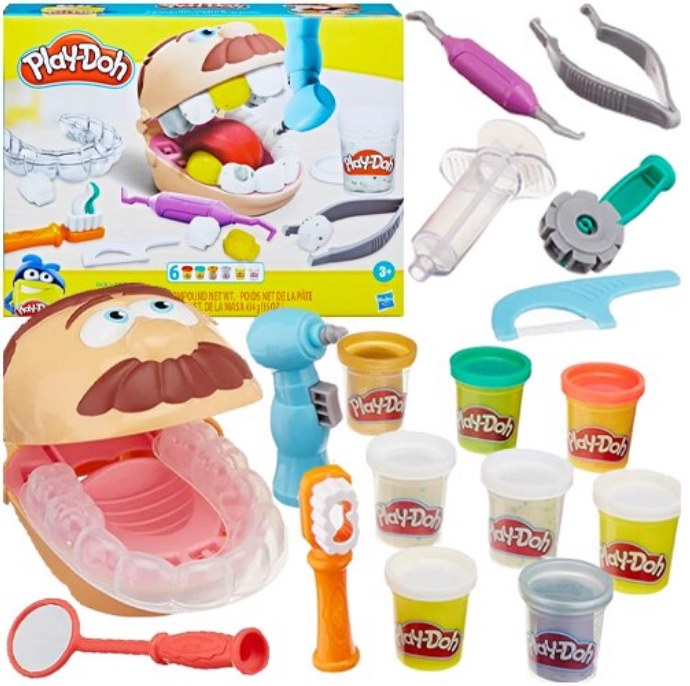 Ez a Hasbro Play-Doh fogorvos gyurma játékszett egy kreatív szerepjáték készlet, amelyben a gyerekek egy játék páciens fej segítségével fogorvosi kezeléseket játszhatnak el, a csomagban színes Play-Doh gyurmák, fogfúró utánzat, fogkefe, csipesz és egyéb orvosi eszközöket utánzó kiegészítők találhatók, így a gyerekek "tömhetik", "tisztíthatják" és formázhatják a fogakat, miközben játékosan ismerkednek a fogápolás fontosságával és fejlődik a kézügyességük és a fantáziájuk. Méret: asztalon használható, több darabos játékszett kb. 28 x 22 x 7 cm-es csomagolásban, több kiegészítő elemmel. Anyag: nem mérgező Play-Doh gyurma és tartós műanyag játékelemek kombinációja. Korosztály: 3 éves kortól ajánlott, kreatív szerepjátékhoz, finommotorika fejlesztéséhez és ismeretterjesztő játékhoz ideális, hosszú ideig leköti a gyerekeket.