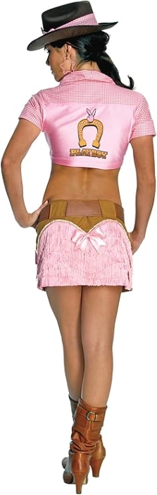 Playboy-inspirált cowgirl jelmez nőknek, amely ötvözi a vadnyugati stílust a Playboy márka jellegzetes megjelenésével. A szett több darabot tartalmaz (például felső, szoknya/shorts, öv és kalap a jellegzetes logóval), így ideális Halloweenre, tematikus bulikra vagy jelmezpartikra.