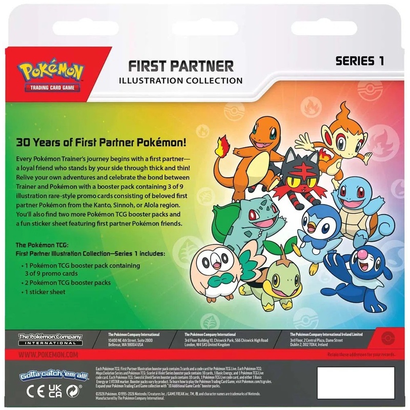 A First Partner Illustration Collection Series 1 egy angol nyelvű Pokémon TCG gyűjtői doboz, ami a legelső társ Pokémonokra épül, Kanto, Sinnoh és Alola régióból. A csomagban van 1 db First Partner Illustration mini csomag, ami 9 féle promóból ad 3 db illusztrációs stílusú promó kártyát, továbbá 2 db Pokémon TCG booster csomag és 1 db matricás lap. A Pokémon világ a videojátékokból indult, és az anime, filmek, valamint a gyűjtögetős kártyajáték tette világszerte ismertté.