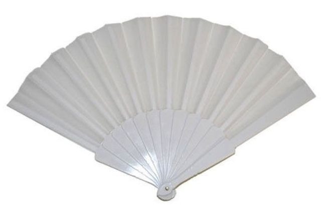 Klasszikus fehér textil legyező farsangi jelmezekhez és elegáns megjelenéshez. Könnyű és praktikus kiegészítő, amely tökéletes választás tematikus bulikra, előadásokhoz vagy különleges alkalmakra.