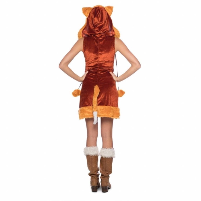 Ez a női róka-jelmez egy könnyen viselhető, állat-inspirált kosztüm, amely egy kapucnis, rókaszerű tunikából vagy ruhából és hozzá illő lágy farki résszel áll, így a viselője egy róka karakterét öltheti magára jelmezes bulin vagy farsangi eseményen. A jelmez játékosan ötvözi az állati mintázatot és egy egyszerű, de figyelemfelkeltő megjelenést, ami ideálissá teszi témákhoz mint erdő- vagy állati party, illetve mesés beöltözések esetén is.
