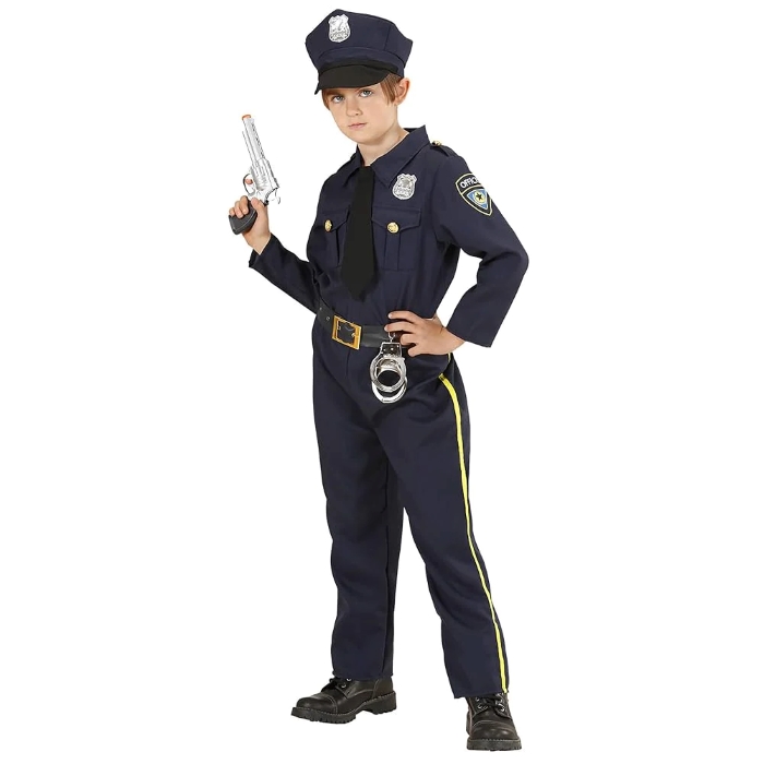 Ez a gyerek rendőr jelmez egy teljesen összeállított farsangi vagy tematikus ruha, mely segítségével a gyermek könnyen belebújhat a rendőr szerepébe. A jelmez hagyományos rendőri stílust jelenít meg, tartalmazza a megfelelő ruhadarabokat és kiegészítőket a karakter hiteles megjelenéséhez, így ideális választás karneválra, jelmezbálba vagy szerepjátékhoz. A termék 100%-ban poliészter anyagból készült, könnyen kezelhető és kényelmes viselet gyerekek számára.