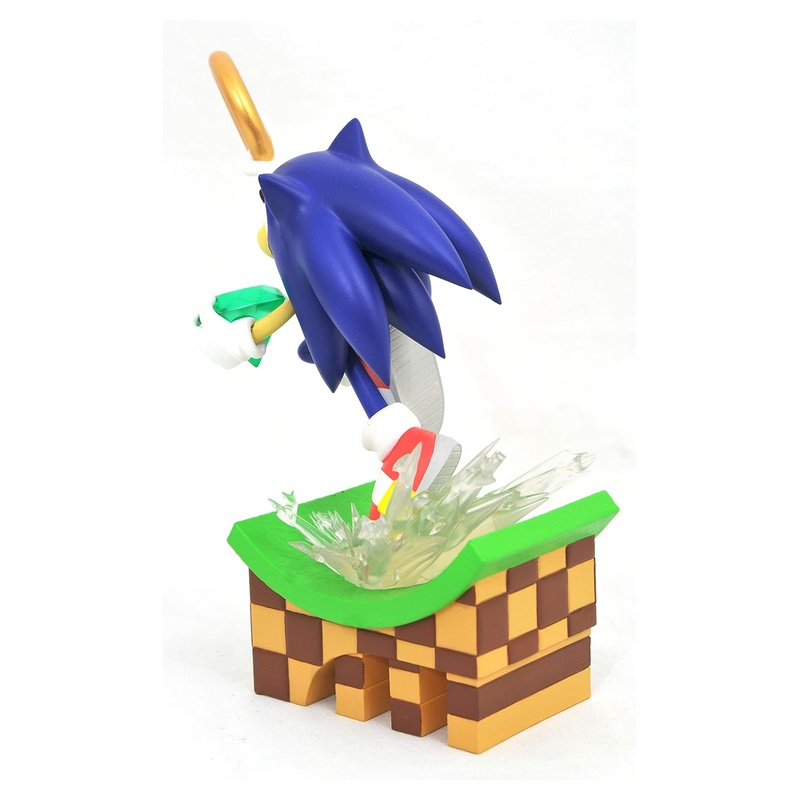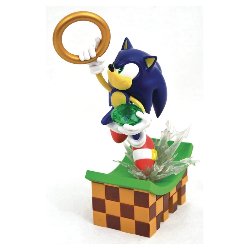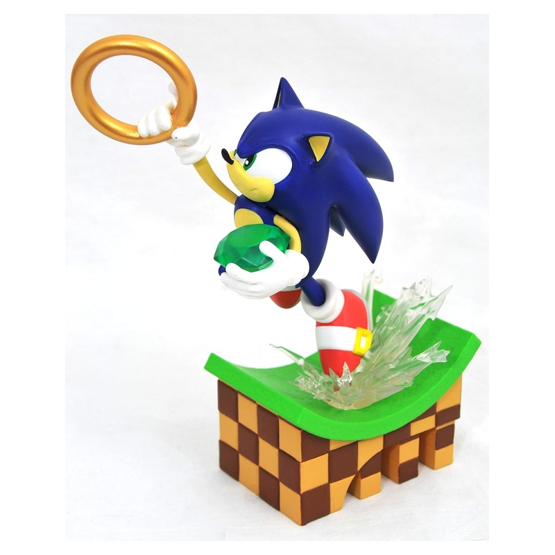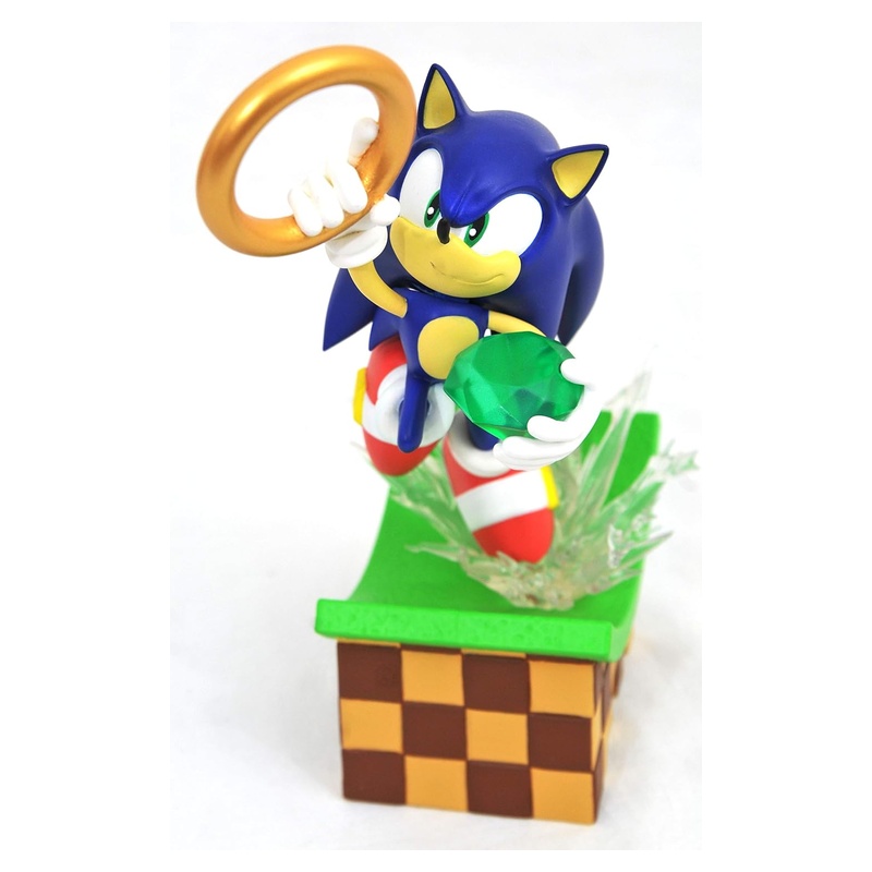 Ez a Sonic Gallery dioráma egy dinamikus jelenetet ábrázol, ahol Sonic egy drágakővel a kezében ugrik, hogy elkapjon egy arany gyűrűt, a Green Hill Zone hangulatát idéző talpon. A kb. 23 cm magas, részletgazdagon festett PVC szobor vitrinben nagyon látványos, a talp miatt stabilan kiállítható. Sonic a Sonic the Hedgehog videojáték-sorozat és a hozzá kapcsolódó franchise ismert főszereplője.