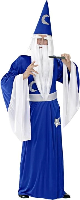 Ez egy kék varázsló jelmez, mely egy hosszú, sötétkék köpenyből, derékszíjból és hegyes, hagyományos boszorkány-/varázslókalapból áll. A ruhadarab klasszikus varázsló-stílust idéz, gyakran ezüst vagy fehér csillag- és holddíszítéssel a kalapon, így ideális választás farsangra, jelmezes bulira vagy tematikus eseményre. A jelmez főleg felnőtteknek készült, poliészter anyagból, könnyen viselhető és a mágikus karakter megjelenését erősíti.