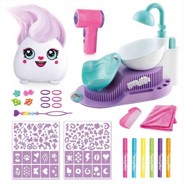 A hófehér Airbrush plüss állatok csak egy jó barátra vágynak, aki színt visz a mindennapjaikba! Válasz egy színt a festékfilcek közül, helyezd a festékszóróba, és indulhat is a móka. Színezd a plüss állatkát kedved szerint, válassz a stencilek közül, hogy izgalmas mintákkal dobd fel a bundáját. Játék után pedig könnyen lemoshatod a dizájnt, hogy holnap új stílussal indítsátok a napot. A lehetőségek tárháza végtelen. A játékot 6 éves kortól ajánljuk. A festékszóró használatához 2db AA elemre van szükség, amit külön szükséges beszerezni. A csomag tartalma: 1 fodrász szék és zuhany a plüssállat mosásához és formázásához, 1 puha plüssállat díszítéshez, 1 airbrush eszköz a színezéshez, 6 kréta filctoll a részletek rajzolásához, 180 öntapadós sablon minták készítéséhez, 17 hajdísz a formázáshoz, 1 frottír fejpánt a haj rögzítéséhez, 1 áttekinthető használati útmutató.