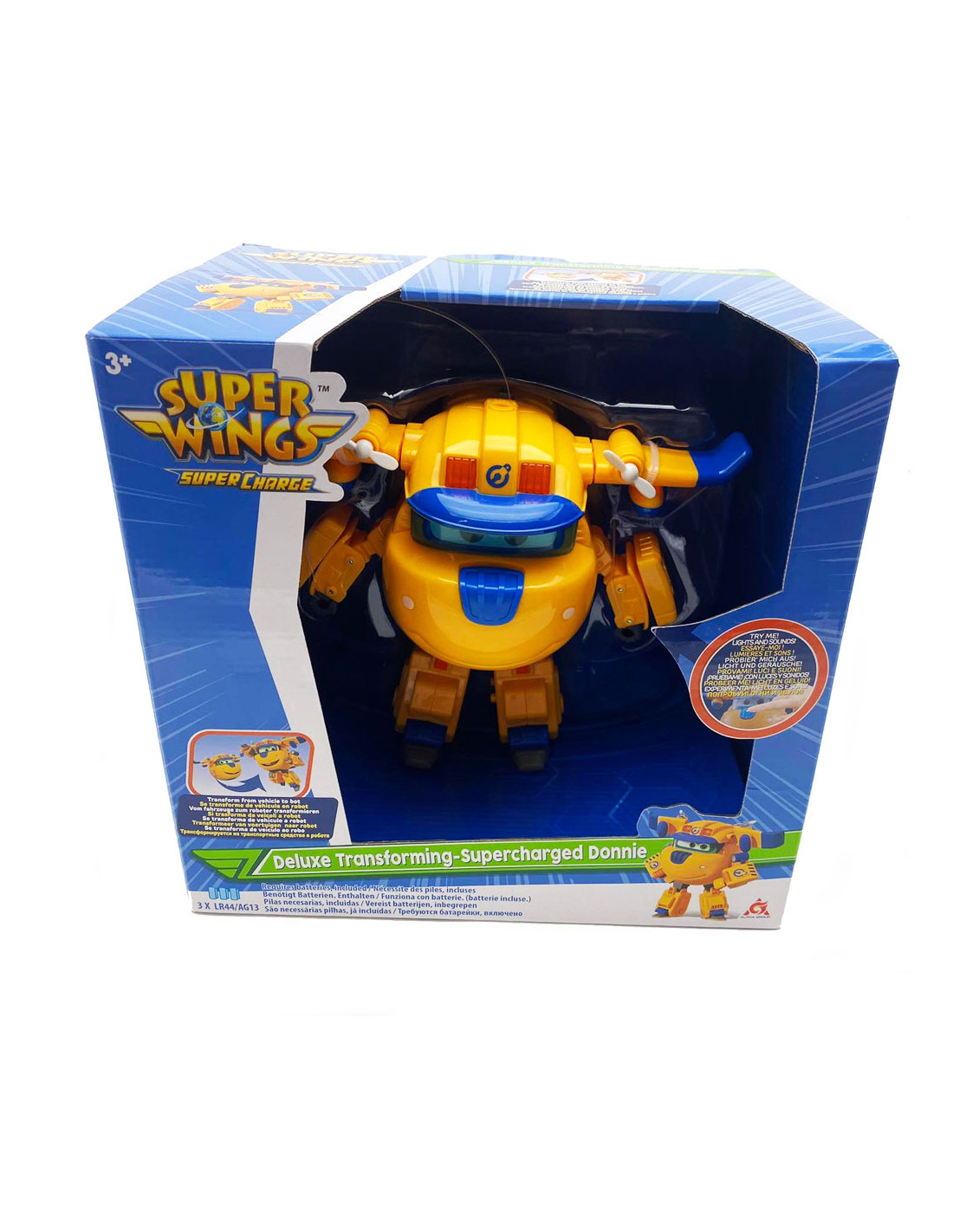 Donnie a Super Wings szárnyalója most most minden eddiginél szuperebb kiadásban csatlakozhat repteredhez. A Deluxe kiadású figura amellett, hogy könnyedén átalakíthatóak robotból repülővé hang és fény effektekkel lett ellátva.á